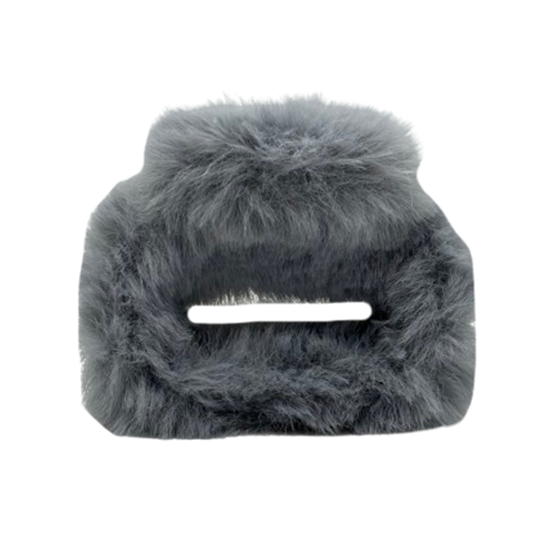 Piranha de acrílico transparente com aplicação de pelo sintético na cor cinza.