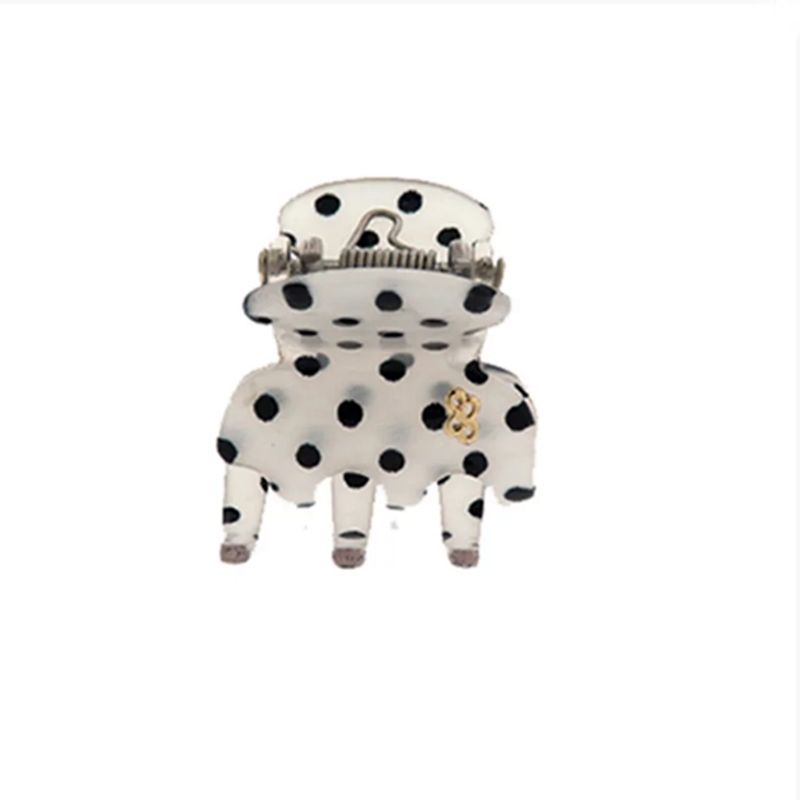 Piranha com material de acrílico com estampa de poás grandes na cor preto; possui mola em aço em inox.