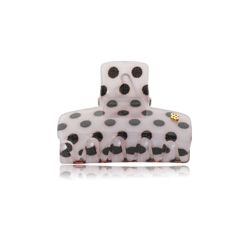 Piranha com material de acrílico de alta qualidade com estampa de póas na cor preto; possui mola aço em inox com formato em B (patenteado).