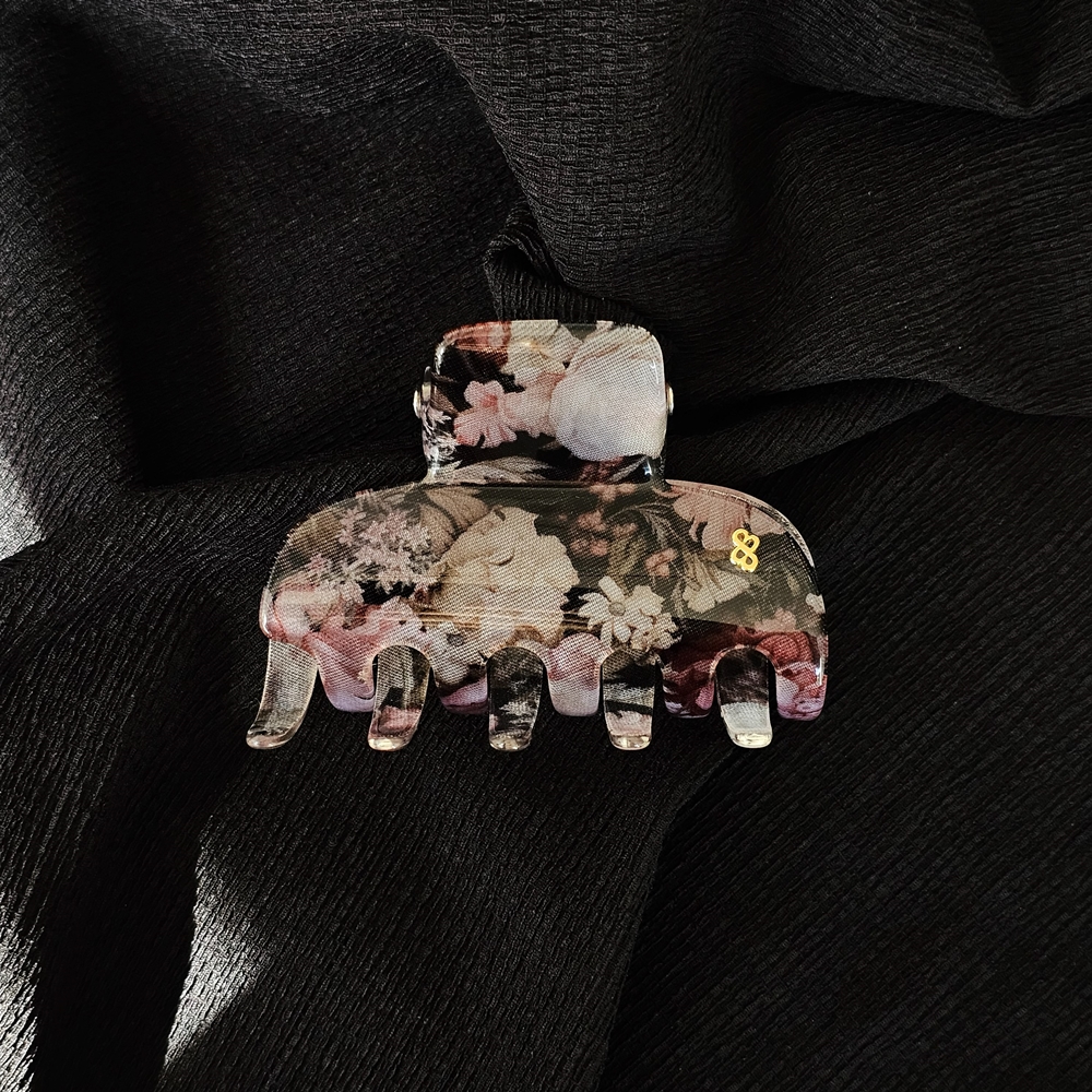 Piranha de cabelo feita em acrílico premium sustentável com estampa floral dark, com 5 dentes de cada lado e bordas arredondadas que evitam marcas e danos nos fios. Produzida artesanalmente no Brasil, possui mola patenteada em aço inox no formato “B”, que garante fixação firme sem machucar. Finalizada com monograma banhado a ouro, une durabilidade, conforto e elegância em uma peça compacta e resistente.