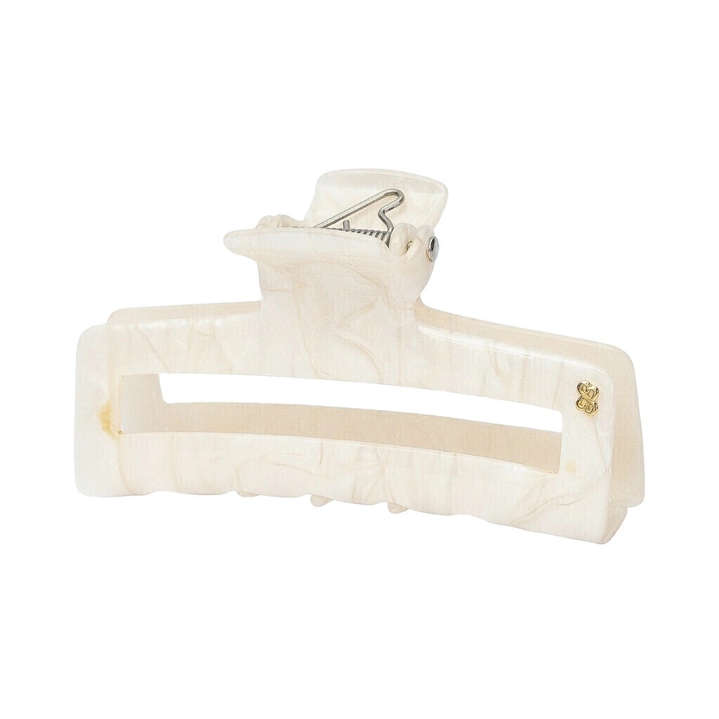 Piranha grande com material de acrílico de alta qualidade na cor marfim imitando madrepérola, com mola em formato B em aço inox e monograma banhado a ouro 24k.