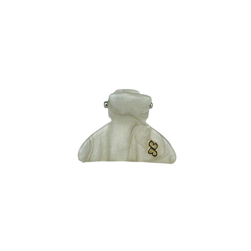 Piranha de cabelo pequena em acrílico de alta qualidade na cor marfim imitando madrepérola, com mola em formato B em aço inox e monograma banhado a ouro 24k.