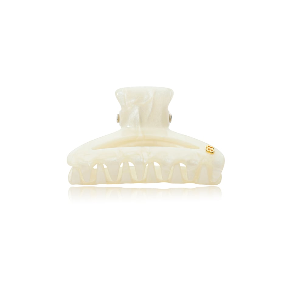 Piranha de cabelo em acrílico de alta qualidade na cor marfim imitando madrepérola, com mola em formato B em aço inox e monograma banhado a ouro 24k.