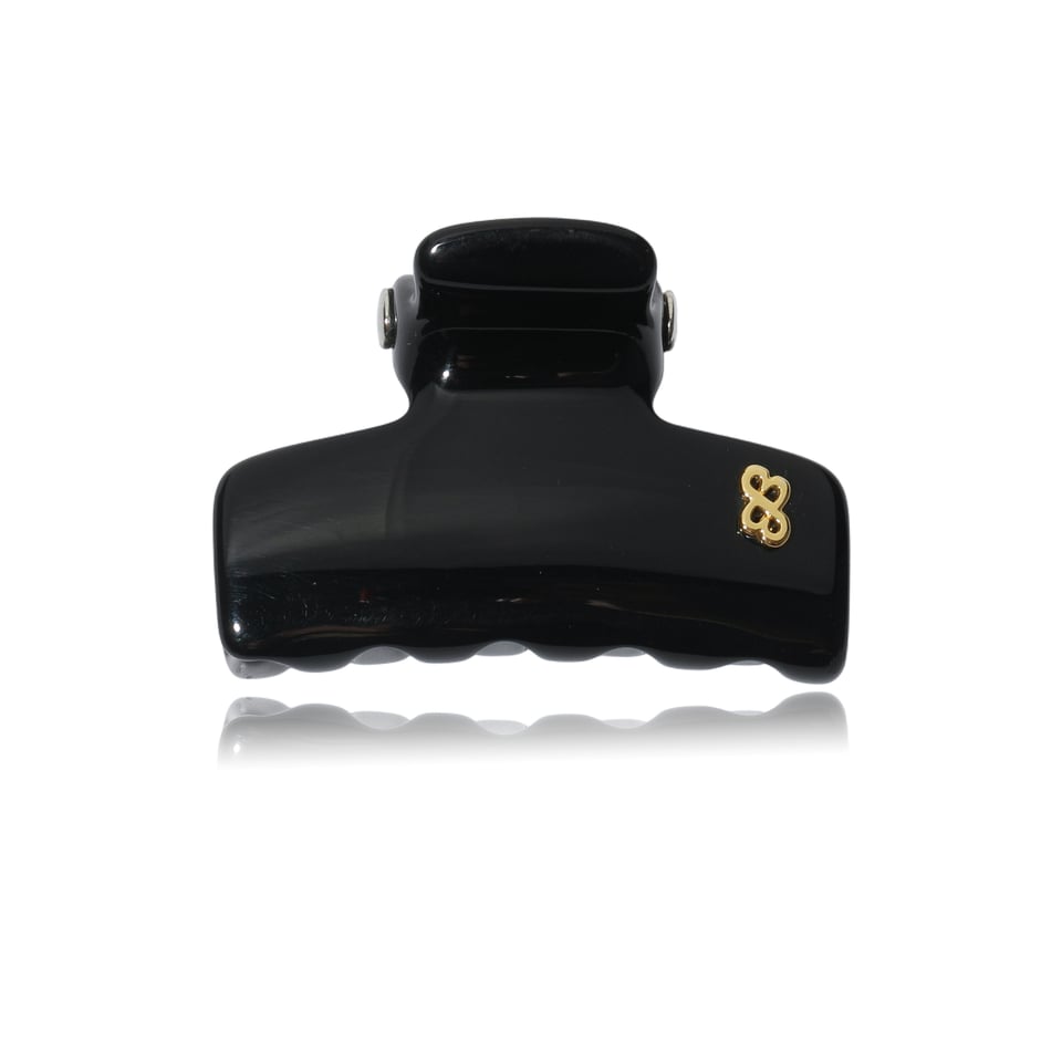 Piranha de cabelo pequena em acrílico de alta qualidade na cor preto, com mola em formato B em aço inox e monograma banhado a ouro 24k.