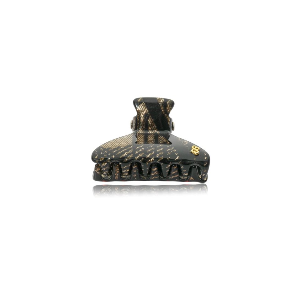 Piranha de cabelo em acrílico de alta qualidade na cor preto com detalhes rendado na cor dourado; com mola em formato B em aço inox e monograma banhado a ouro 24k.