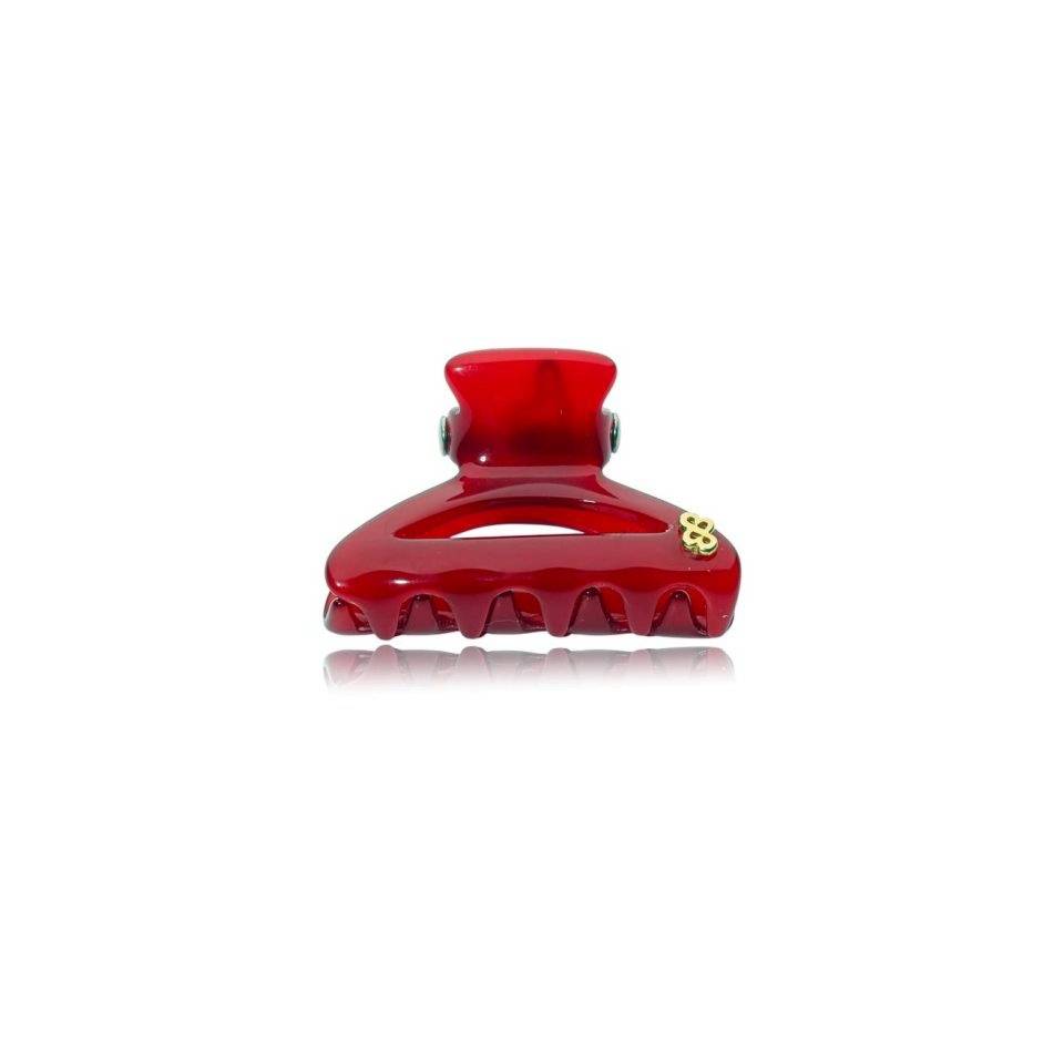 Piranha de cabelo pequena em acrílico de alta qualidade na cor vermelho escuro, com mola em formato B em aço inox e monograma banhado a ouro 24k.