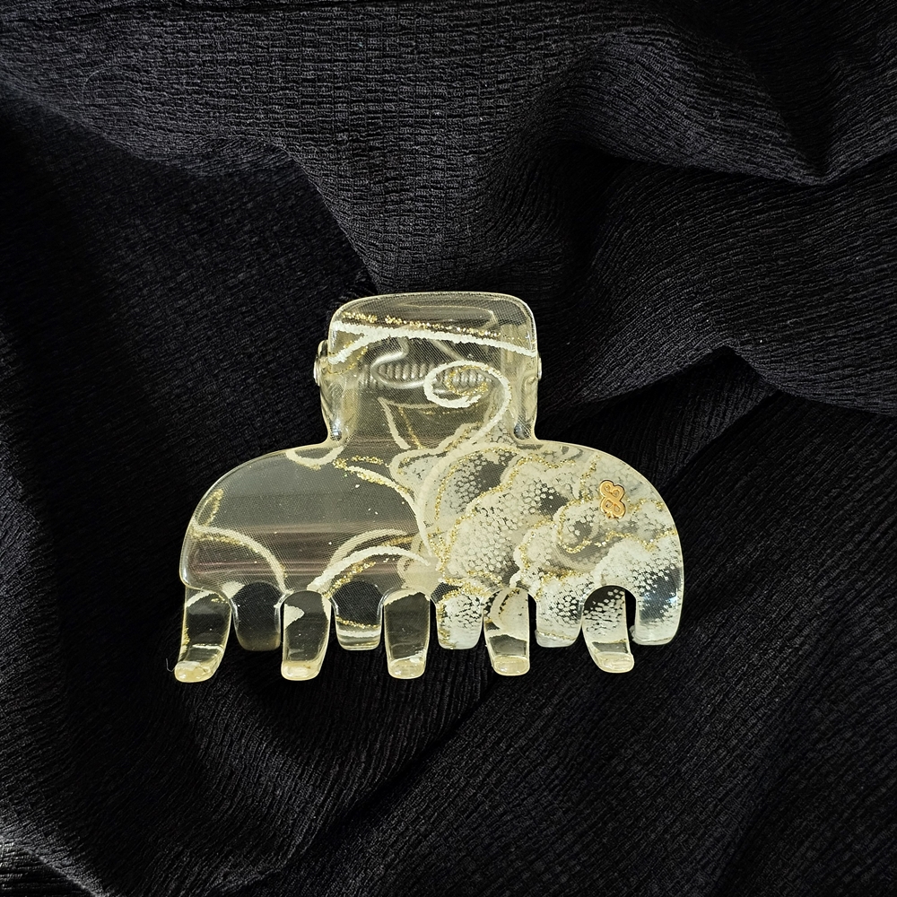 Piranha de cabelo feita em acrílico premium sustentável na cor amarelo translúcido com estampa floral com glitter, com 5 dentes de cada lado e bordas arredondadas que evitam marcas e danos nos fios. Produzida artesanalmente no Brasil, possui mola patenteada em aço inox no formato “B”, que garante fixação firme sem machucar. Finalizada com monograma banhado a ouro, une durabilidade, conforto e elegância em uma peça compacta e resistente.