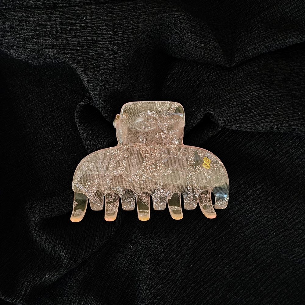 Piranha de cabelo feita em acrílico premium sustentável na cor rosa translúcido com estampa floral com glitter, com 5 dentes de cada lado e bordas arredondadas que evitam marcas e danos nos fios. Produzida artesanalmente no Brasil, possui mola patenteada em aço inox no formato “B”, que garante fixação firme sem machucar. Finalizada com monograma banhado a ouro, une durabilidade, conforto e elegância em uma peça compacta e resistente.