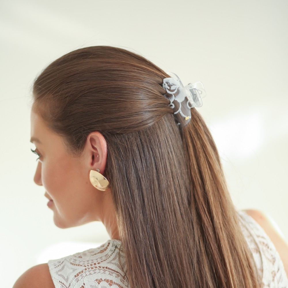 Piranha de cabelo feita em acrílico premium sustentável transparente rendada branco com glitter, com 5 dentes de cada lado e bordas arredondadas que evitam marcas e danos nos fios. Produzida artesanalmente no Brasil, possui mola patenteada em aço inox no formato “B”, que garante fixação firme sem machucar. Finalizada com monograma banhado a ouro, une durabilidade, conforto e elegância em uma peça compacta e resistente.