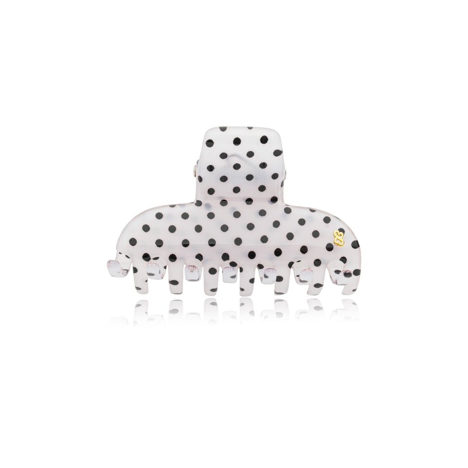 A Piranha Bianca Accessory é feita artesanalmente em acrílico premium com estampa póa preto, trazendo um toque moderno e sofisticado ao visual.