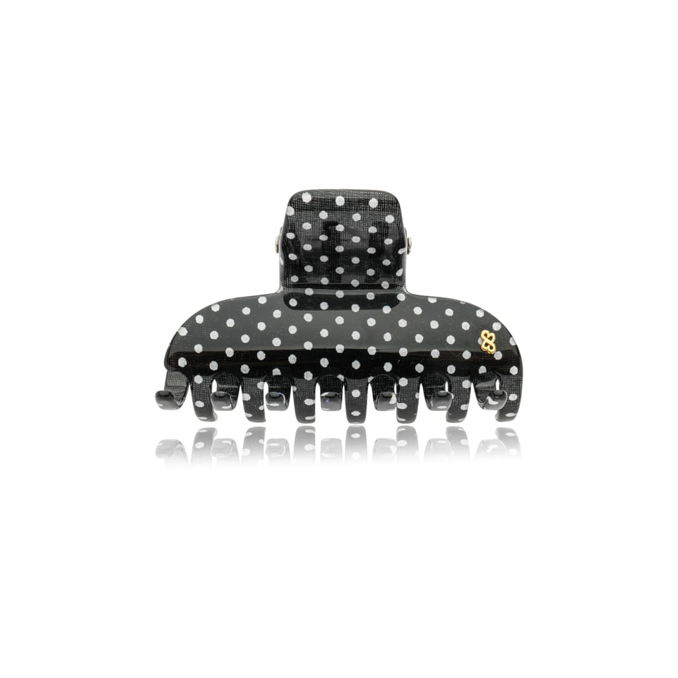 A Piranha Bianca Accessory é feita artesanalmente em acrílico premium com estampa poá branco, trazendo um toque moderno e sofisticado ao visual.