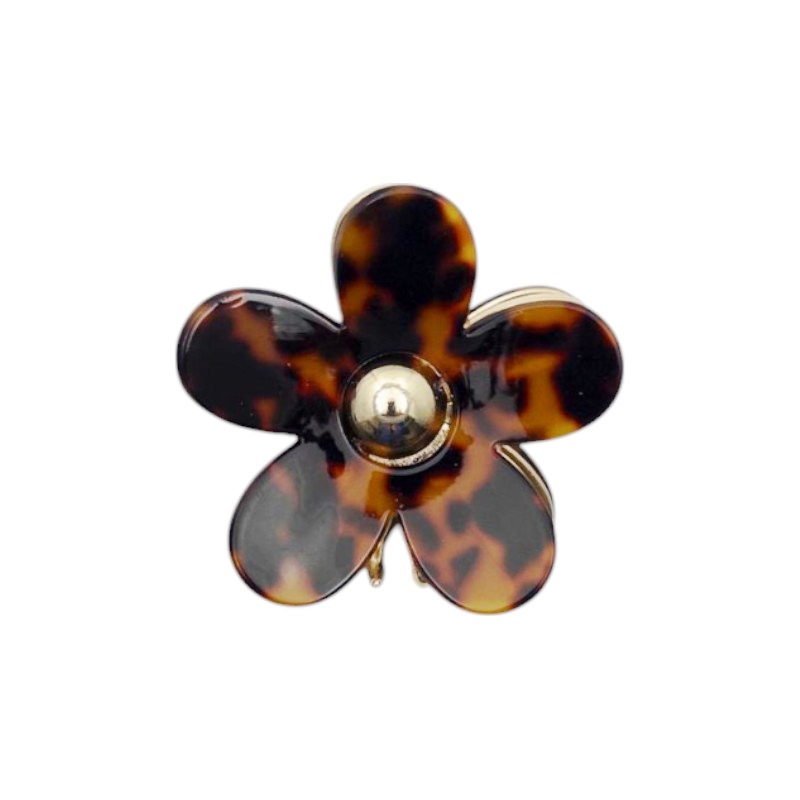 Piranha de cabelo no formato de flor com metal dourado e aplicação de acetato na estampa animal print marrom escuro.