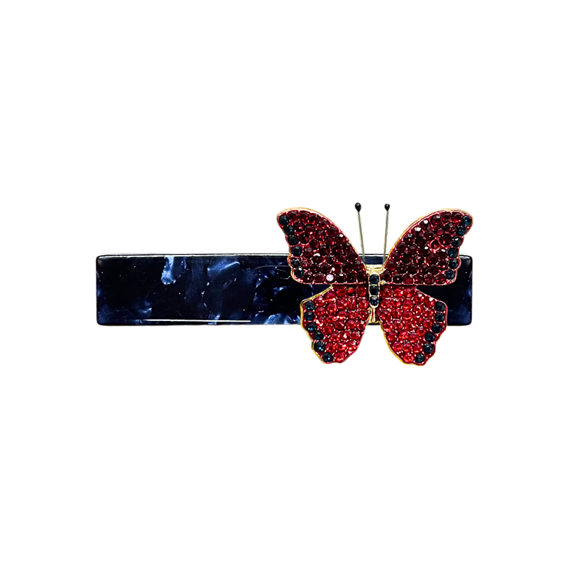 Presilha metal prateado com acetato na cor preto marmorizado e com borboleta de metal com aplicação de cristais nas cores vermelho e azul marinho.