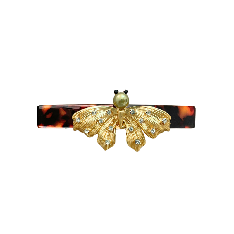 Presilha acetato na cor marrom tartaruga com mariposa de metal dourado fosco com aplicação de cristais na cor branco (cristal) e pérola esverdeada.