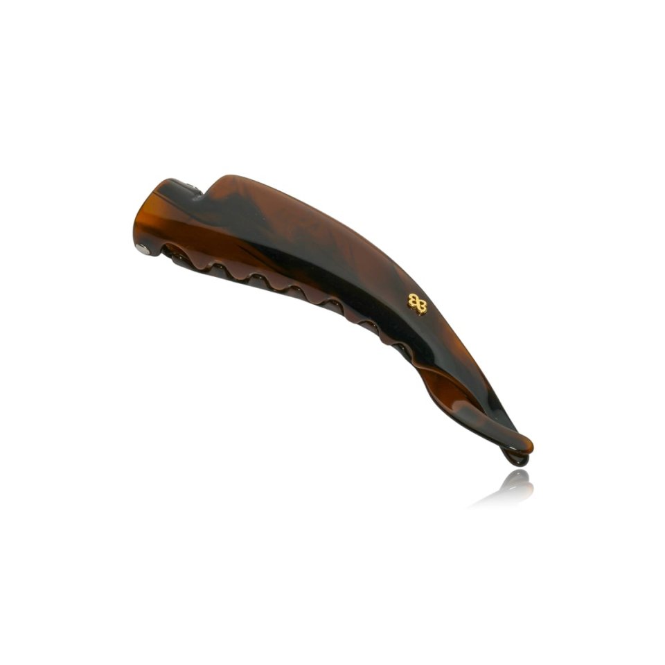 Presilha banana retangular em acrílico de alta qualidade na cor marrom, levemente curvado e encaixado com ilhós de metal.