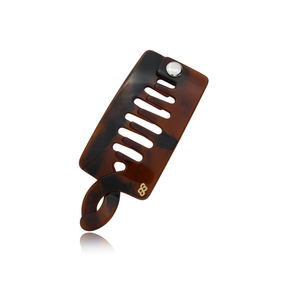 Presilha banana retangular em acrílico de alta qualidade na cor marrom, levemente curvado com dentes entrelaçados e encaixado com ilhós de metal.