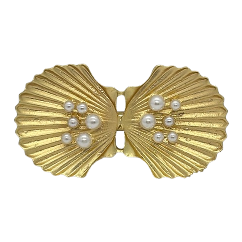 Presilha bico de pato metal dourado com design de concha e aplicação de perolinhas.