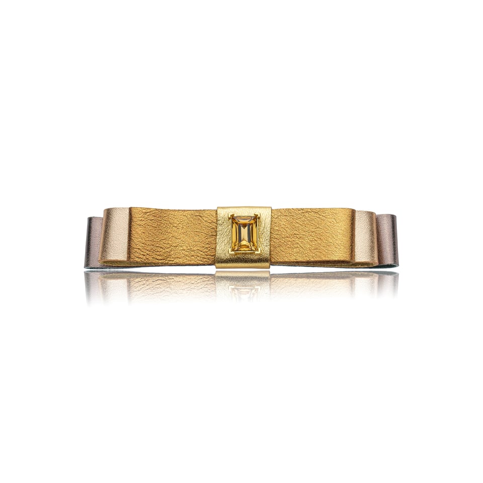 Presilha metal prateado com laço de couro legítimo em 3 tons metalizados com detalhe de cristal na cor dourada.