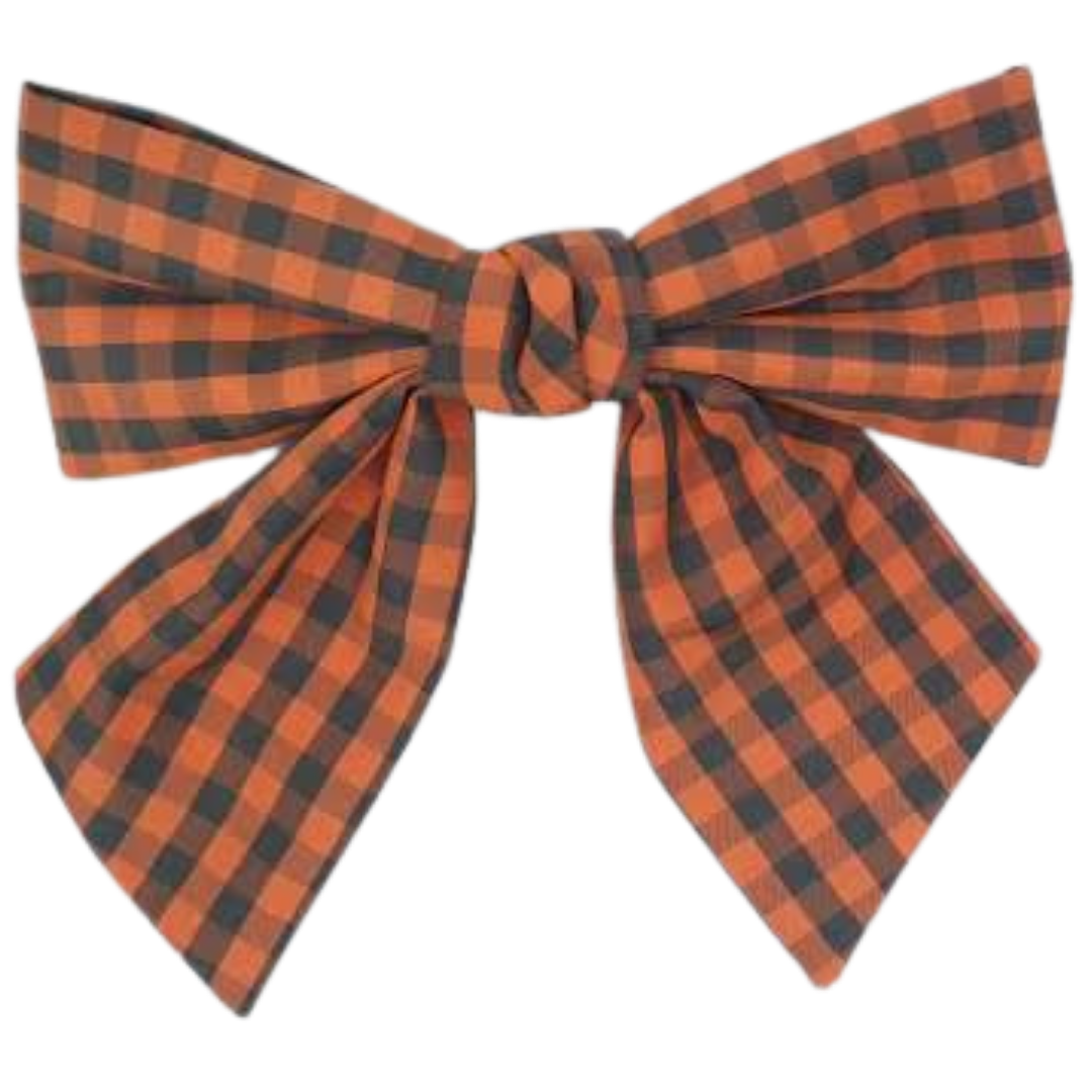 Presilha metal prateado com laço de tecido de algodão estampado na cor laranja.