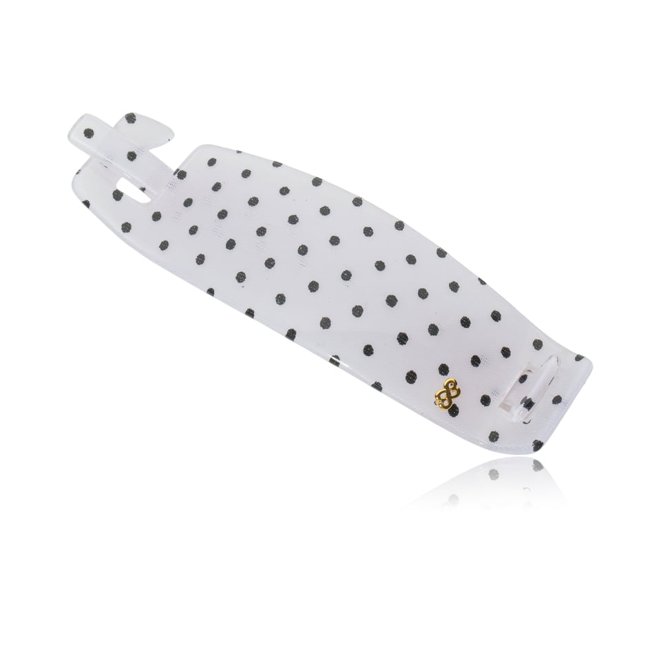 Presilha retangular em acrílico de alta qualidade na cor branco e bolinha na cor preto com palito solto e acabamento polido à mão em todos os cantos para não danificar o cabelo e monograma banhado a ouro 24k.