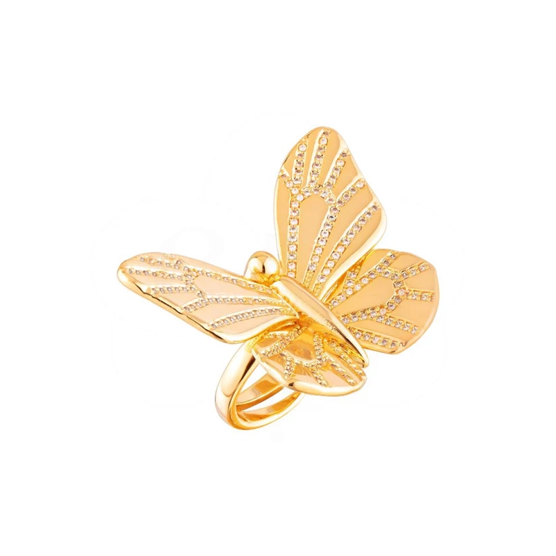 Anel ajustável banho de ouro no formato de borboleta com micro zircônias cravejadas na cor branco (cristal).