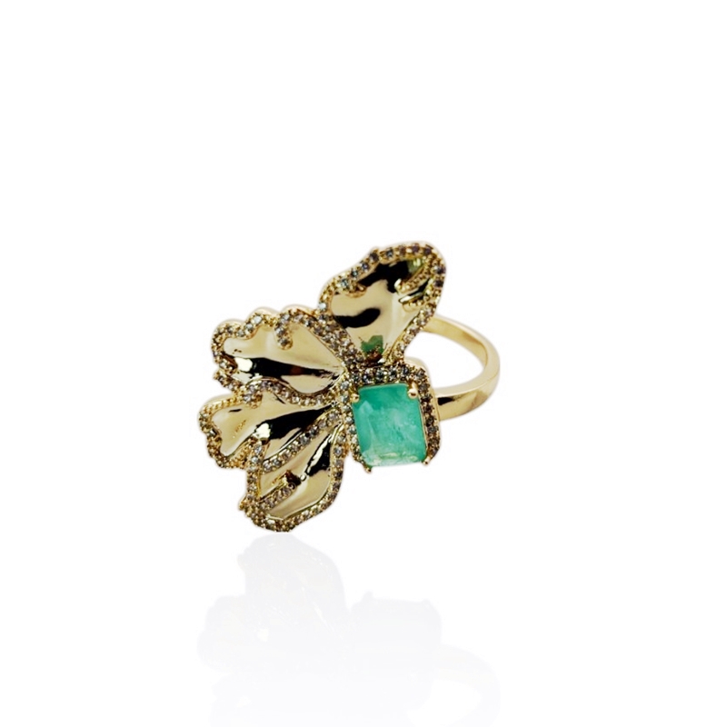 Anel banho de ouro com micro zircônias cravejadas na cor branco (cristal) e cristal fusion na cor turmalina.