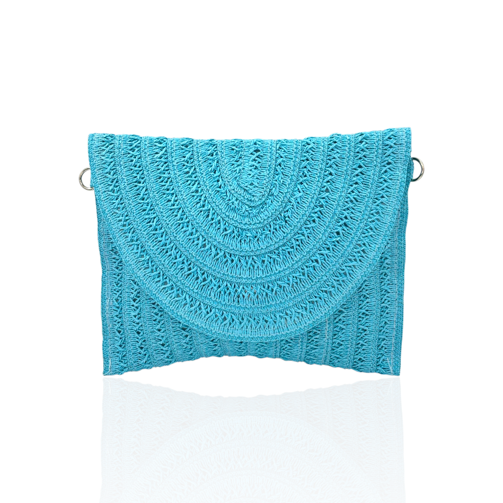 Bolsa carteira confeccionada em palha na cor azul com forro interno de tecido da mesma cor.