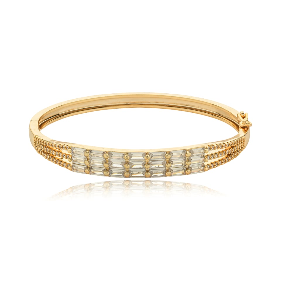 Bracelete banho de ouro com cravação de micro zircônias e zircônias baguetes na cor branco (cristal).