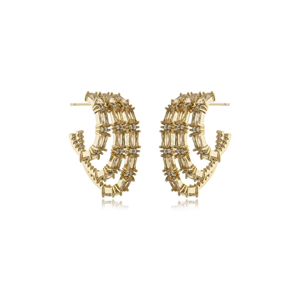 Brinco banho de ouro com micro zircônias cravejadas na cor branco (cristal) e zircônias retangulares cravejadas na cor bege.