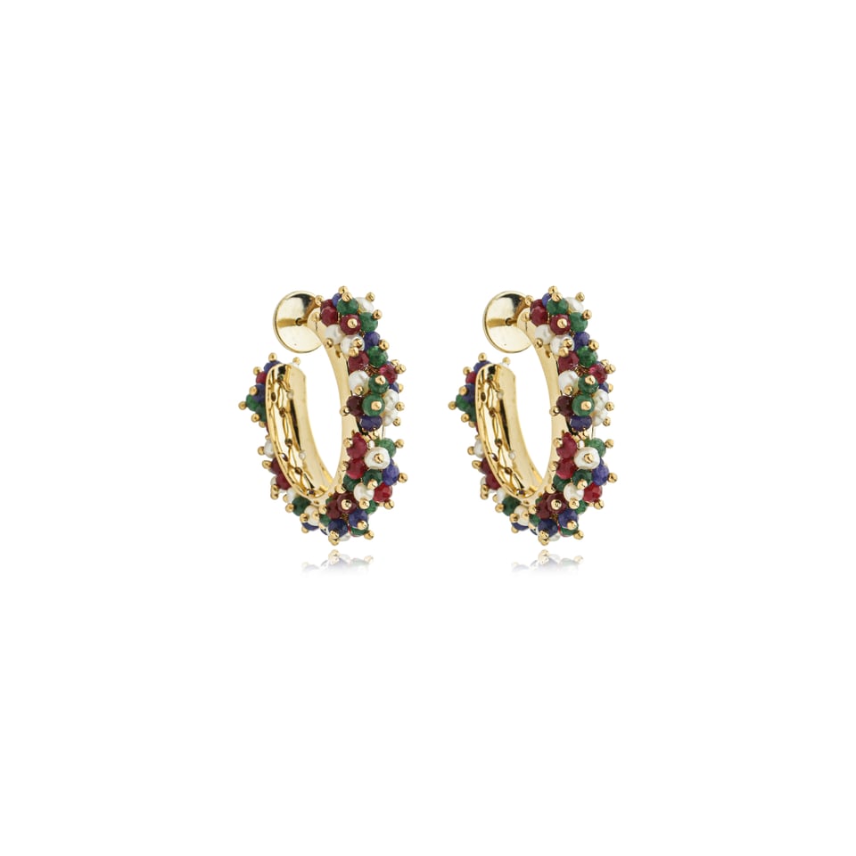 Brinco argola aberta banho de ouro com aplicação de perolinhas e cristais nas cores verde, azul e vinho.