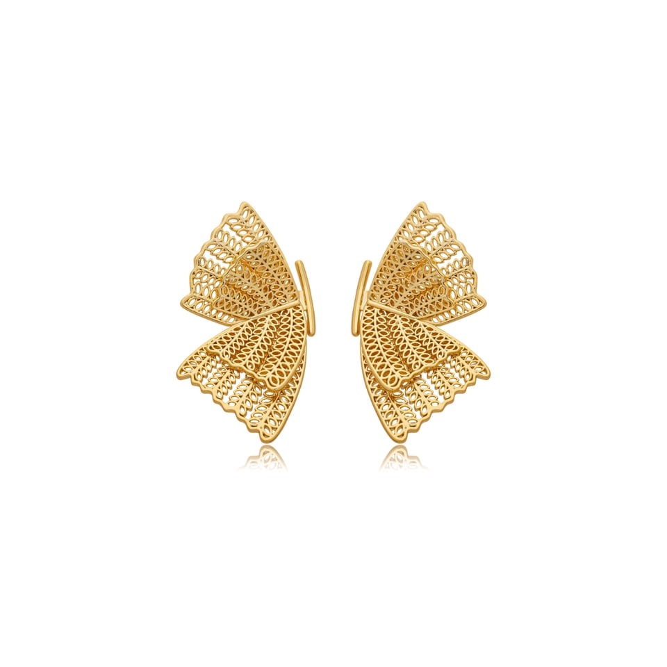 Brinco banho de ouro no formato de borboleta no metal rendado.