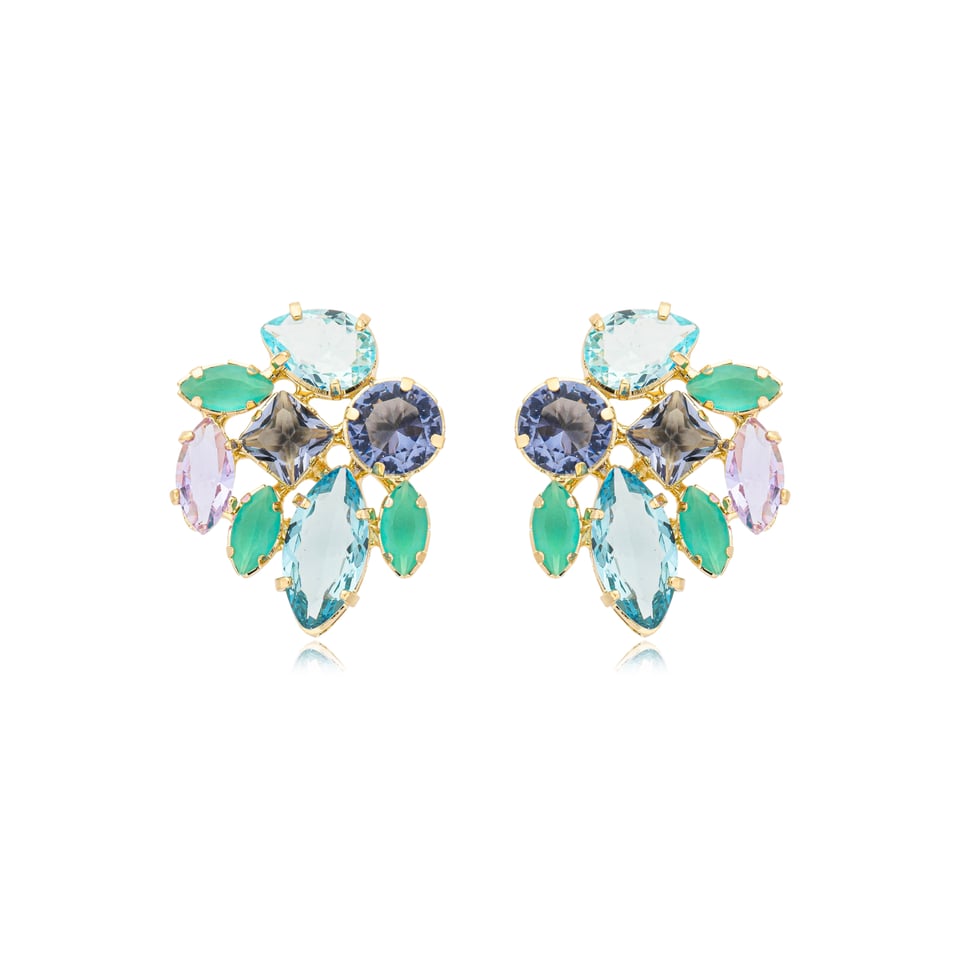 Brinco banho de ouro com aplicação de cristais coloridos.