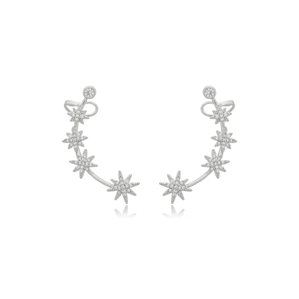 Brinco ear cuff banho de ródio com estrelas cravejadas de micro zircônias na cor branco (cristal).