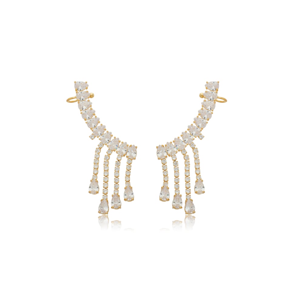 Brinco ear cuff banho de ouro com zircônias cravejadas na cor branco (cristal) e franjas rivieras com cravação de zircônias na cor branco (cristal).
