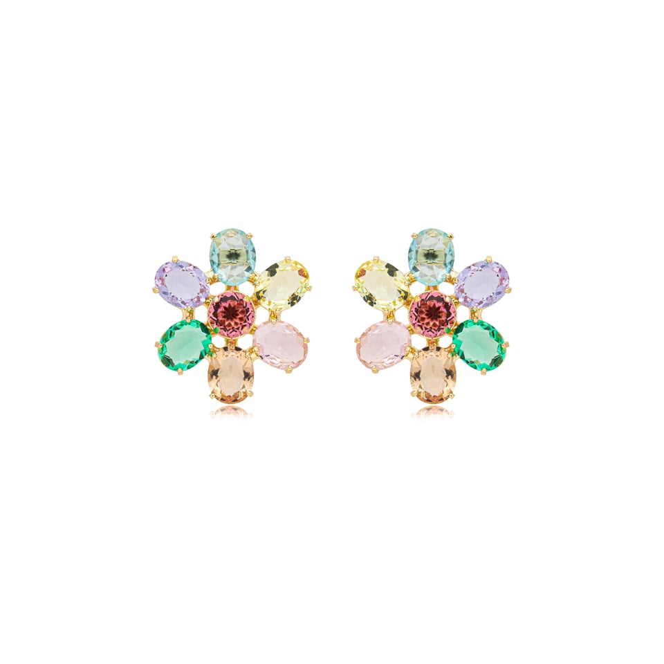 Brinco banho de ouro com aplicação de cristais coloridos.