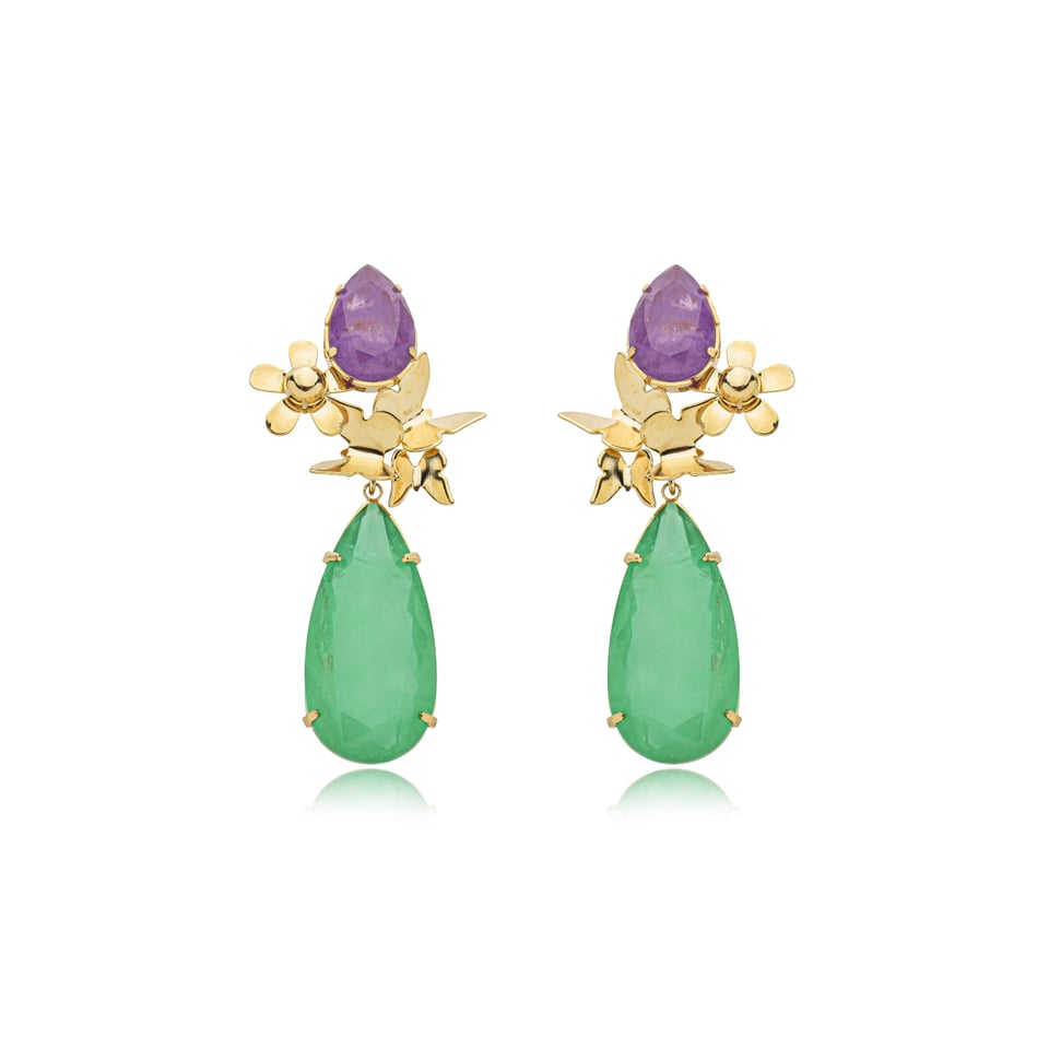 Brinco banho de ouro com base de cristal em gota na cor roxo, com flor e borboletas no metal liso polido e aplicação de cristal em gota na cor verde turmalina.