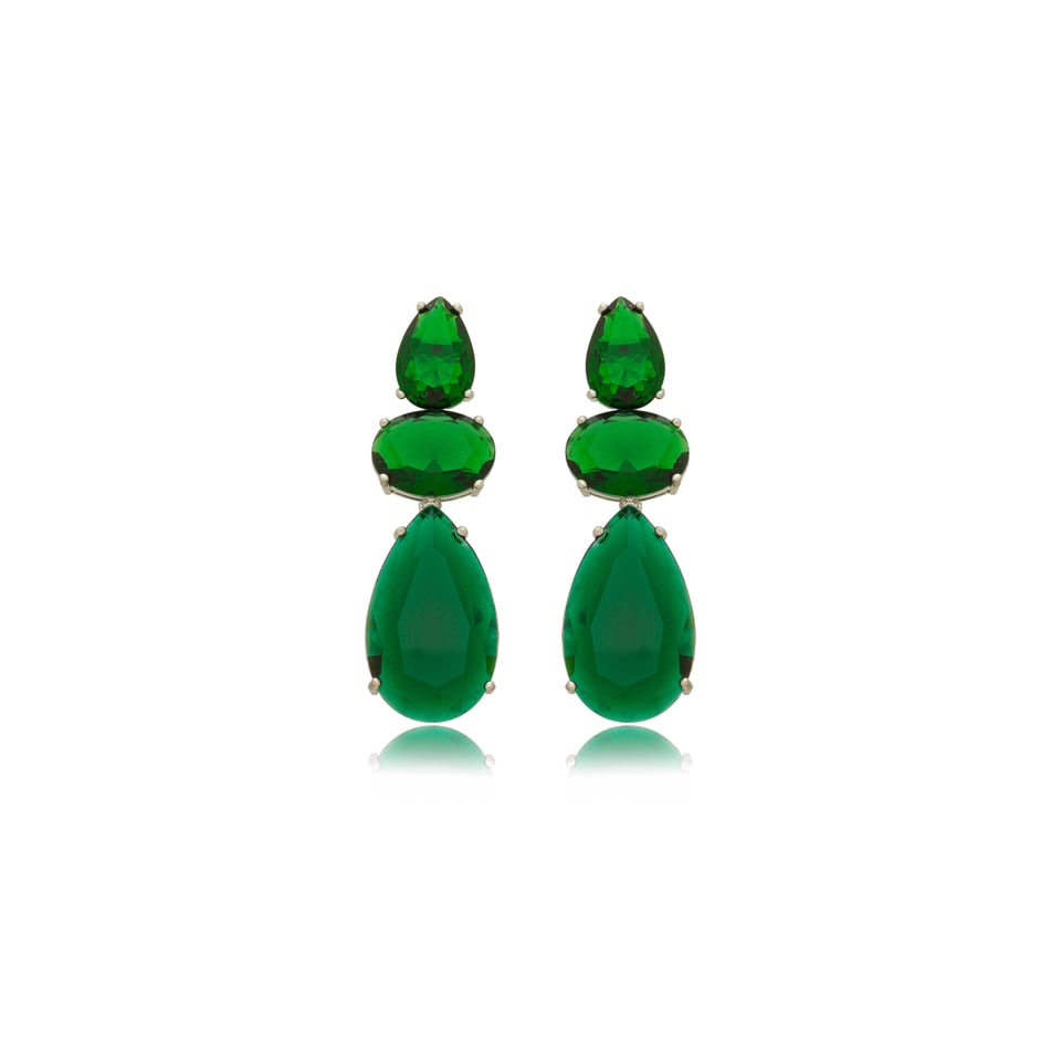 Brinco banho de ródio com cravação de cristais na cor verde esmeralda.