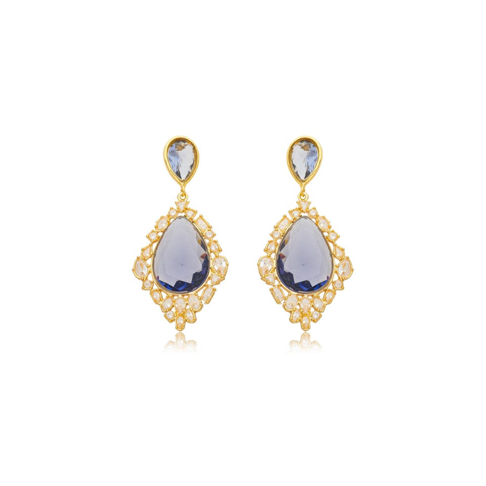 Brinco banho de ouro com aplicação de cristais nas cores roxo e branco (cristal).