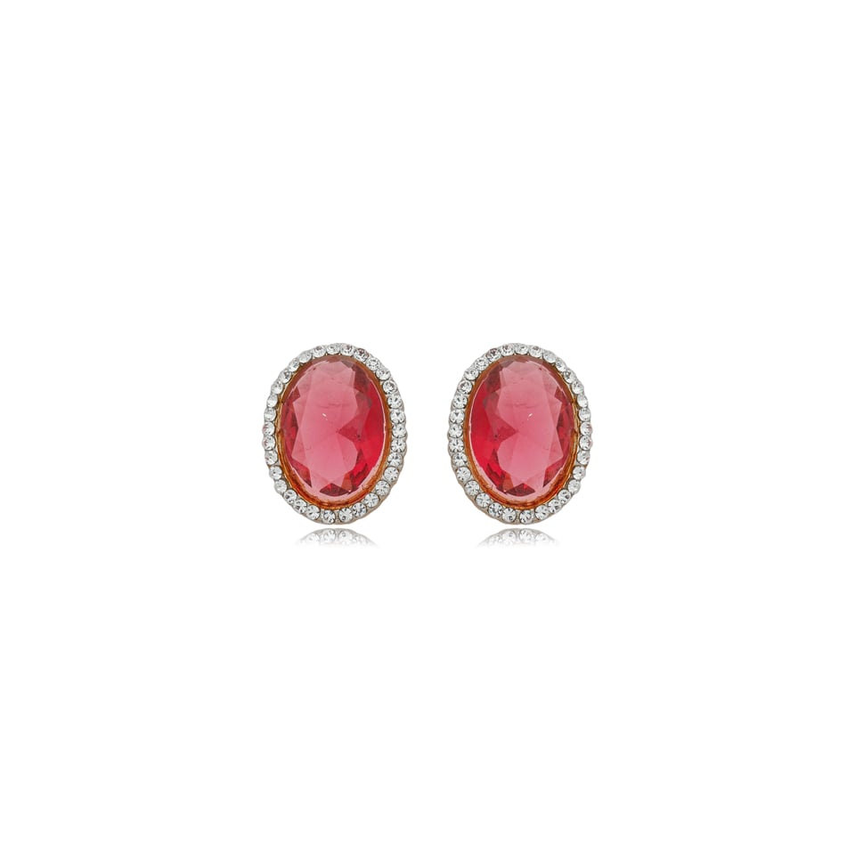 Brinco banho de ouro com cristal oval na cor rosa e aplicação de micro cristais swarovski na cor branco (cristal).