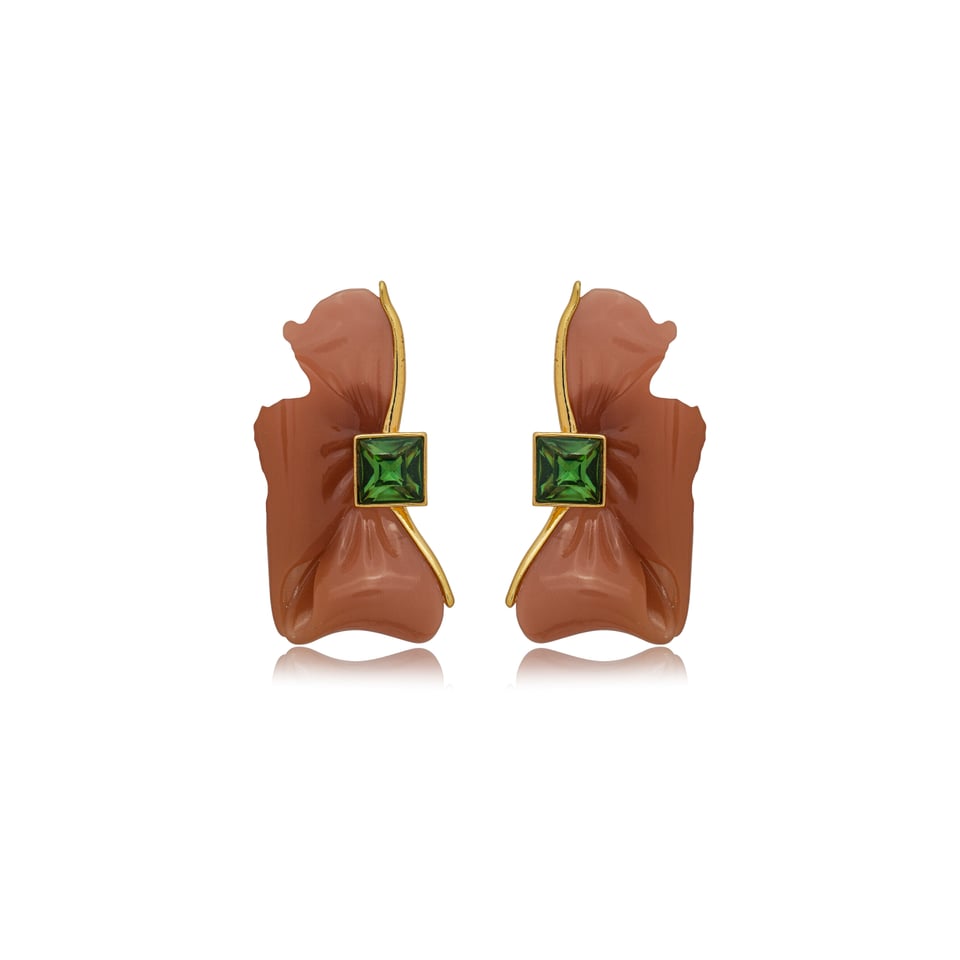 Brinco banho dourado com resina no formato de laço na cor marrom e aplicação de cristal quadrado na cor verde.