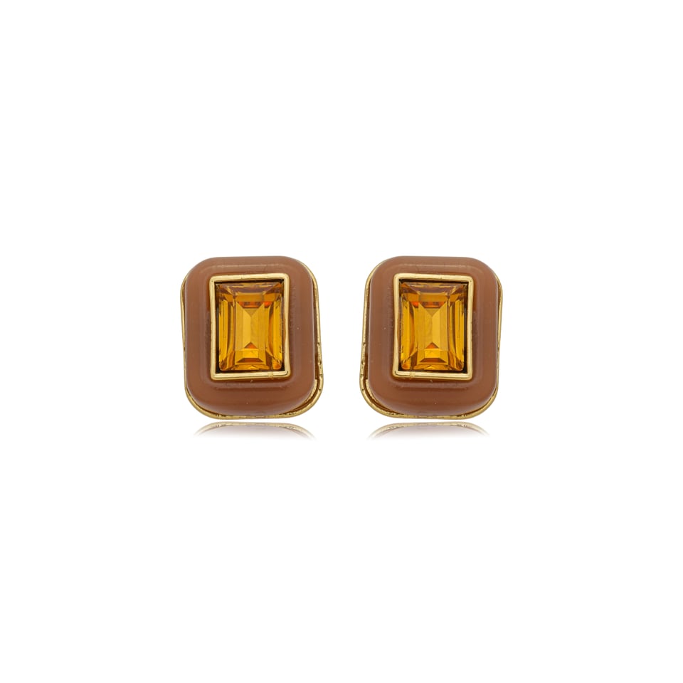 Brinco banho dourado com resina na cor marrom com cristal na cor topázio.