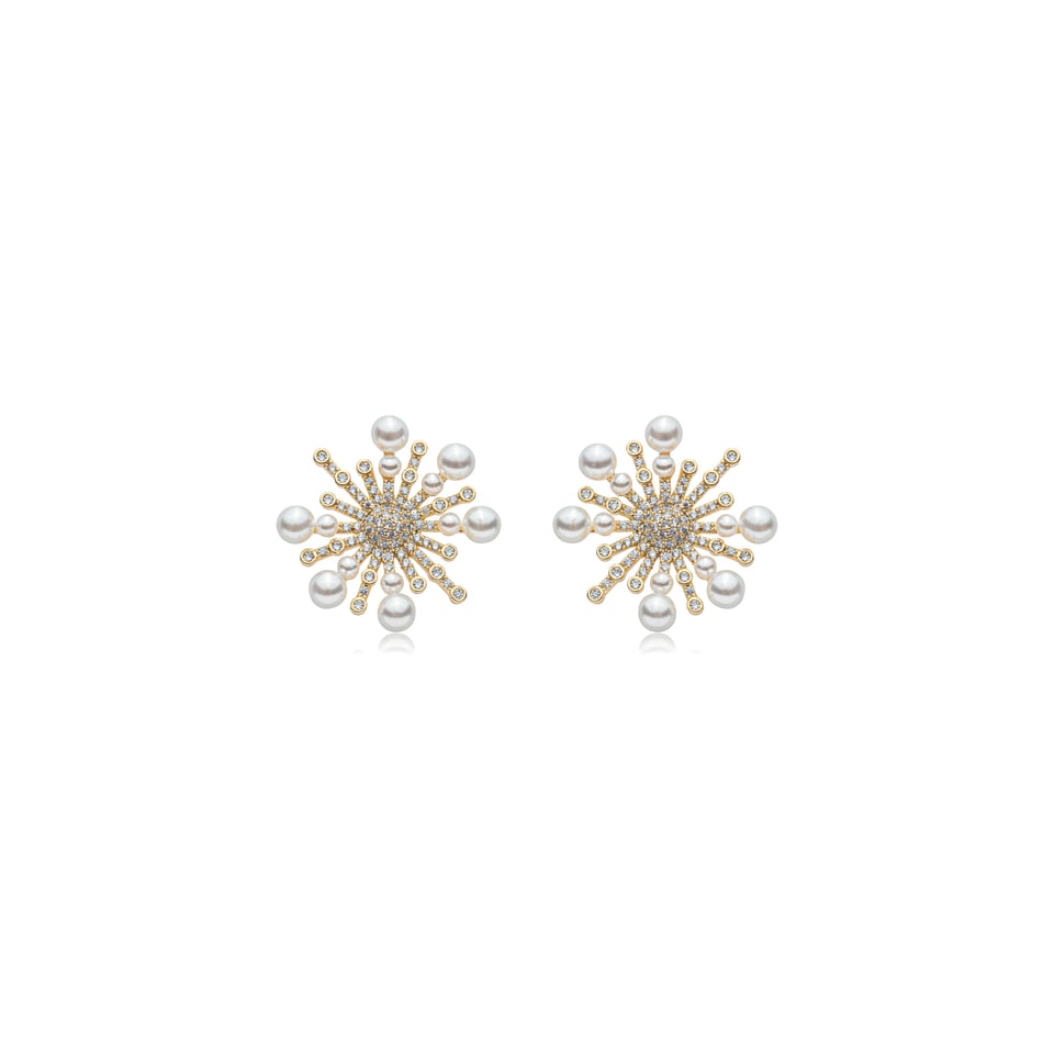 Brinco banho de ouro com cravação de micro zircônias na cor branco (cristal) e aplicação de pérolas de dois tamanhos diferentes.