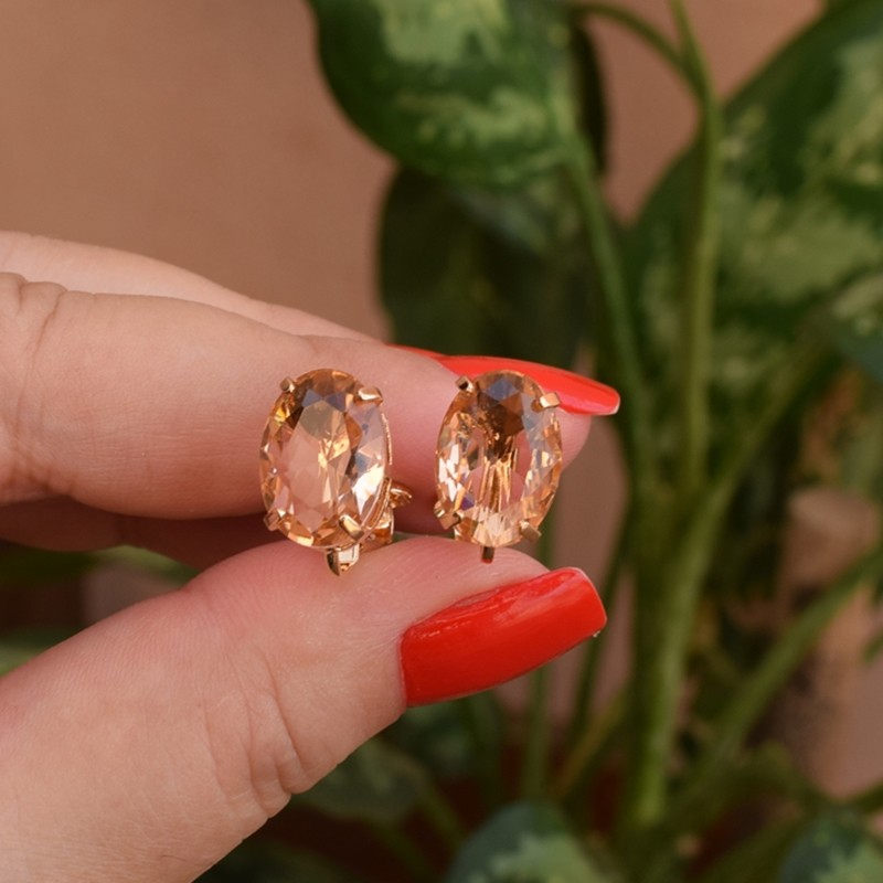 Brinco pressão banho de ouro com cristal oval na cor topázio.