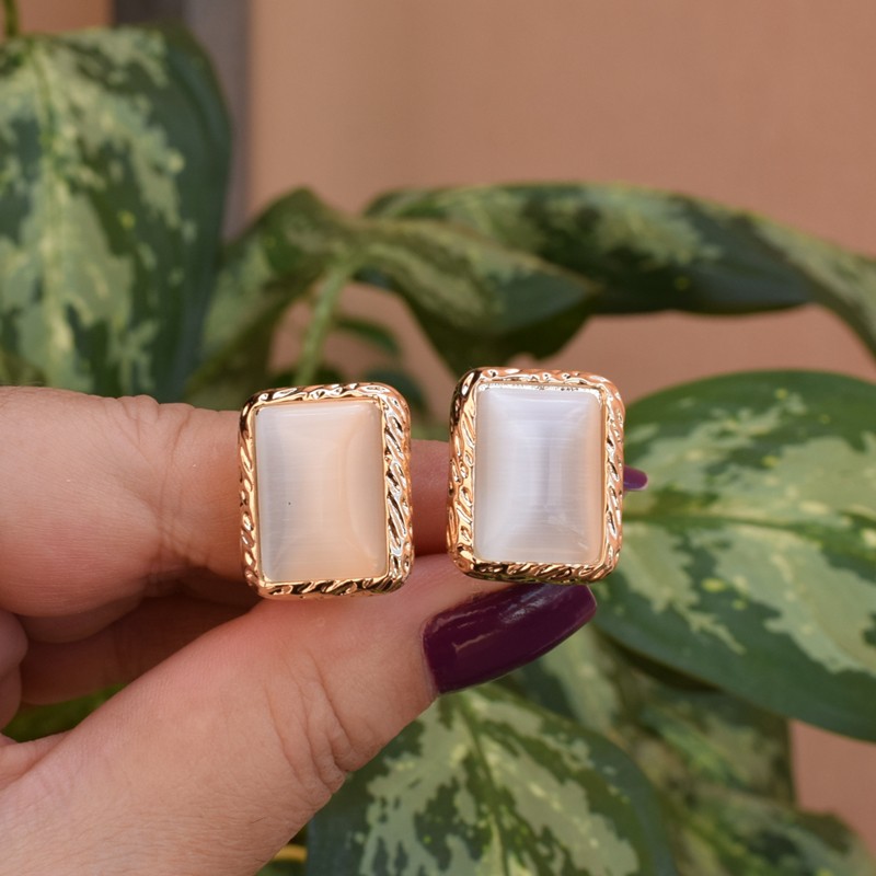 Brinco pressão banho de ouro com cristal de olho de gato retangular.