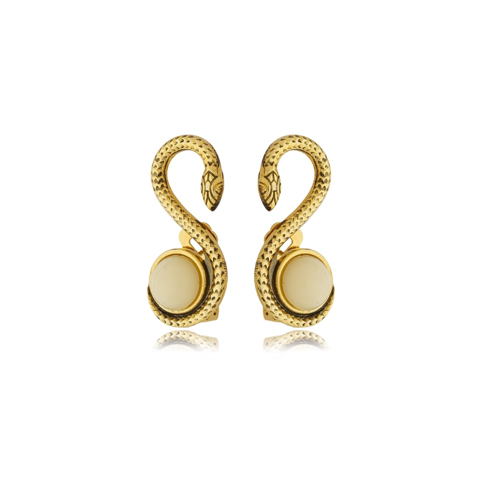 Brinco de pressão banho dourado velho com aplicação de pedra redonda na cor bege.