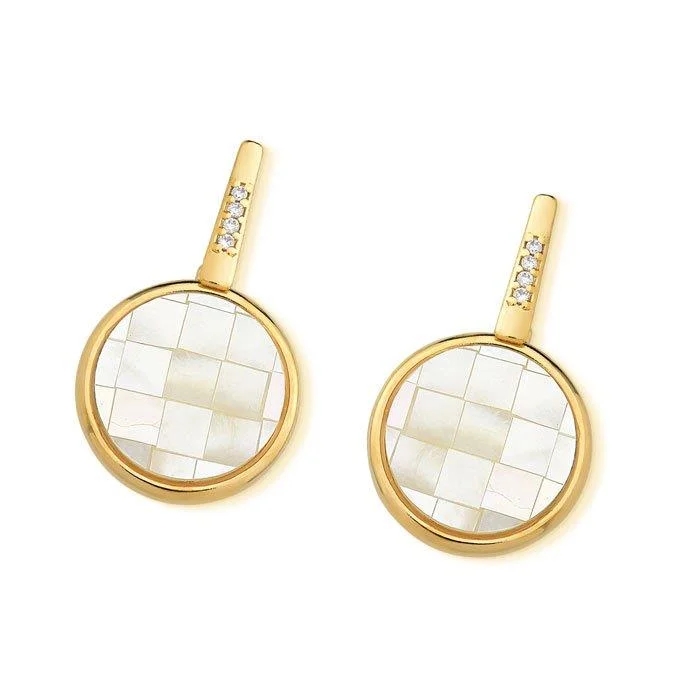 Brinco banho de ouro com base reta com micro zircônias cravejadas e pêndulo redondo com mosaico de madrepérola.