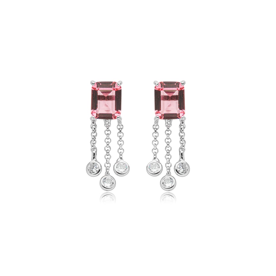 Brinco banho de ródio com cristal retangular na cor rosa e franjas de corrente com aplicação de cristais redondos na cor branco (cristal).