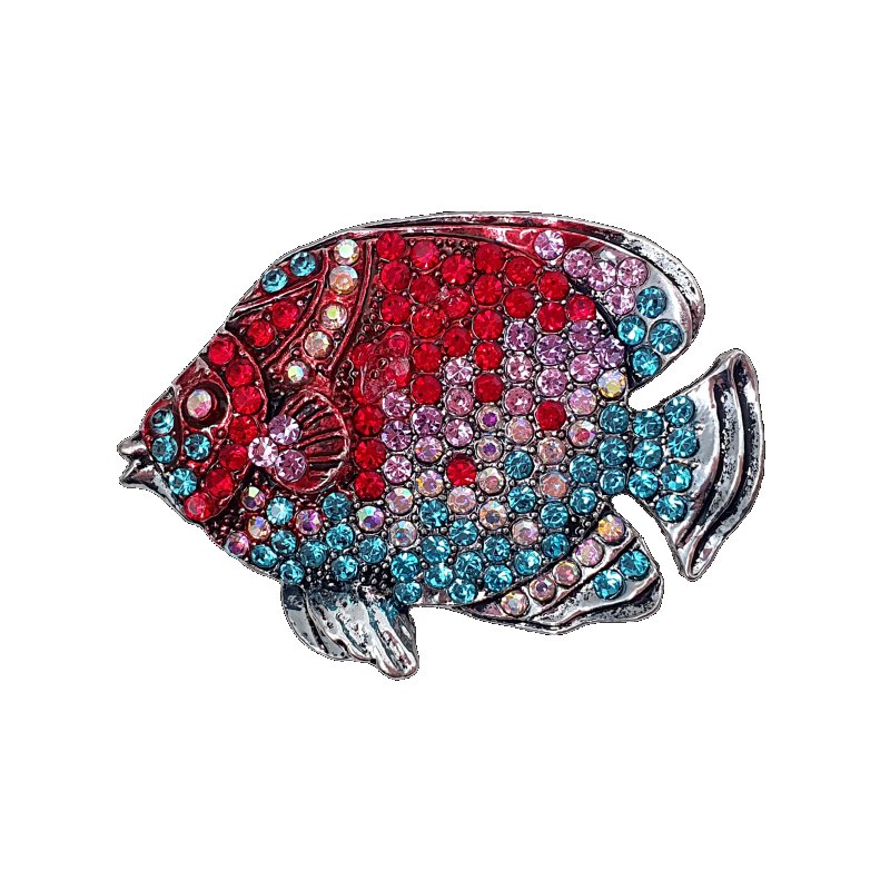 Broche magnético banho prateado com cravação de cristais em tons de azul, vermelho e lilás.