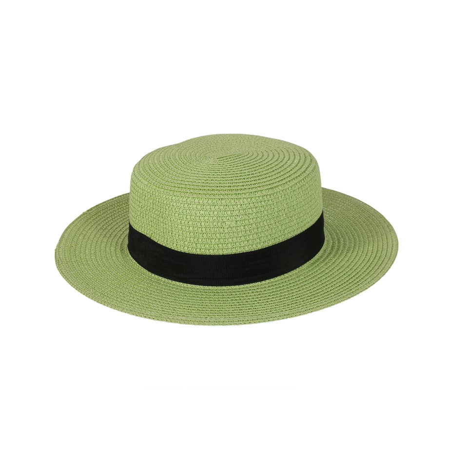 Chapéu de palha sintética na cor verde menta com faixa na cor preta.