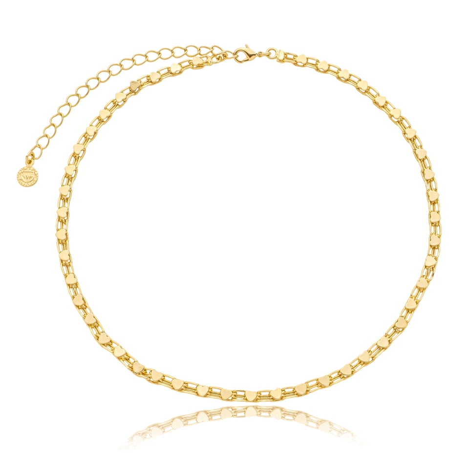 Colar tipo choker banho de ouro tipo malha com formato de corações.